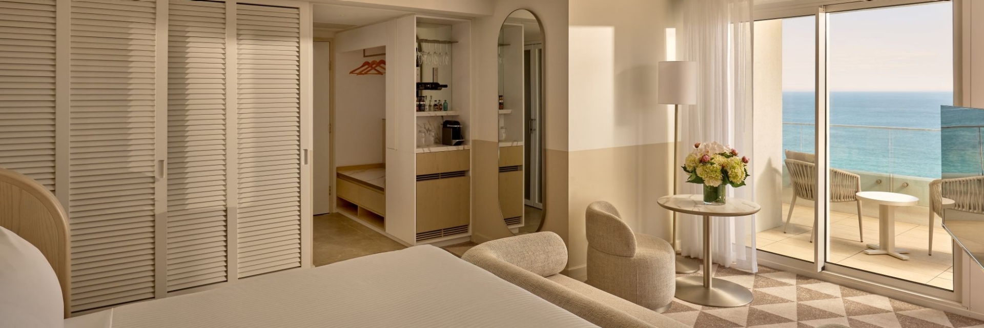 The hotel offers 198 elegantly appointed rooms, designed in soft tones that evoke sophisticated coastal luxury. Among them, 22 suites offer spacious lounges and floor-to-ceiling windows, with most enjoying ocean views and select suites featuring private outdoor baths, creating a seamless connection to the coastline.